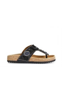 Flip-flop slider model with cork bottom and adjustable strap decorated with degradé rhinestones. a cross between boho and ethnic style for a stylish summer