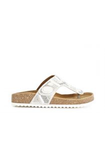 Flip-flop slider model with cork bottom and adjustable strap decorated with degradé rhinestones. a cross between boho and ethnic style for a stylish summer