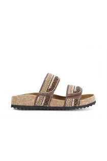 Low slider sandals with cork bottom and adjustable straps decorated with degradé rhinestones. a cross between boho and ethnic style for a stylish summer