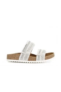 Low slider sandals with cork bottom and adjustable straps decorated with degradé rhinestones. a cross between boho and ethnic style for a stylish summer