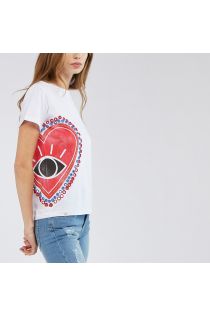 Cotton jersey T-shirt. A large heart made with a watercolour-effect shaded print and mirror applications fill the front and back