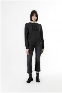 Sweater in warm and soft wool blend yarn. stockinette stitch and jacquard workmanship for our "be noir" slogan embellished with expertly applied rhinestones. available in a very trendy two-tone variant and two solid color variants.