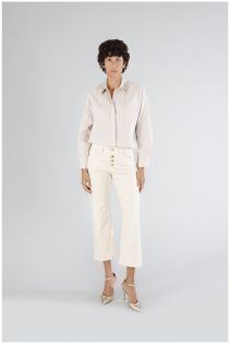 Cropped bootcut trousers made of stretch bull denim fabric. visible button closure. garment that is suitable for casual occasions with a t-shirt and flat shoes.
