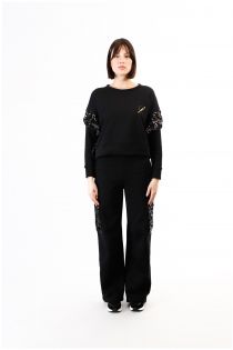Cropped crew neck sweatshirt made of cotton fleece. long sleeves and ruffles in sequin fabric applied on the armhole and continuing on both sides. extremely comfortable functional and trendy garment.