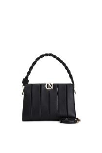 Rigid shoulder bag with draped workmanship and contrasting cafènoir logo. woven tubular shoulder strap. zip closure. bag equipped with second shoulder strap.
