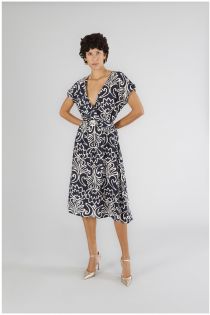 Below-the-knee length dress with crossed "v" neckline. sash with logo at the waist made of viscose marocaine with exclusive print. dress recommended for all day occasions and also perfect for office looks.