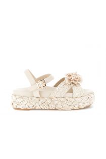 cross-over wedge sandals with raffia band and flowers beige