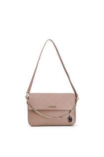 Bandoleer with all-over embossed logo. double compartment and double zip. zipped front pocket. golden decorative chain with removable plate.