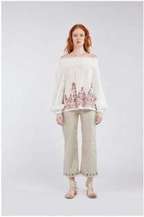 Culotte trousers in stretch cotton sateen. A light application of beaded passementerie decorates the leg hem