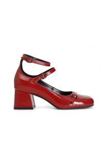 Patent effect pumps with two ankle straps and 3 buckles. 60mm thick heel. the insole is in leather.