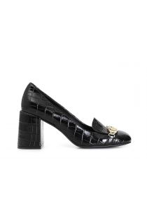 Crocodile effect print pumps with personalized horsebit. 80 mm high banded heel. the insole is in leather. ideal in combination with multiple looks from morning to evening.