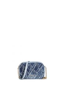 denim camera bag with rivets, rhinestones, chain shoulder strap and shoulder strap jeans