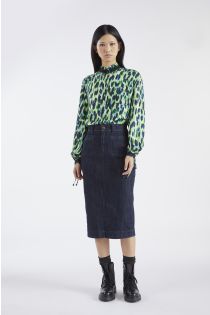 Soft denim canvas pencil skirt with particular zigzag stitching in contrasting yarn and a precious painted button