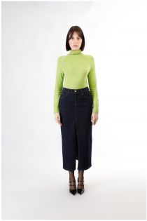 Long denim skirt with front slit. front zip and button closure. key look: long skirt with an xxl sweater with extra sleeves.