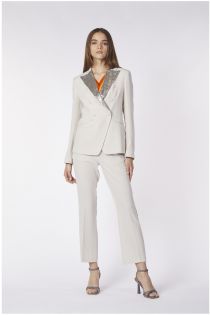 Double-breasted jacket in a fluid fabric. sequin fabric on the lapels enriches and embellishes the garment making it perfect for a special evening.