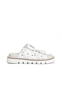 Denim fabric slipper with double buckle. the upper is enriched with studs and rhinestones. the wedge is 2.9 cm high. a shoe that combines style practicality and versatility. perfect footwear for summer to wear with long wide skirts.