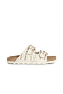 Flat slipper sandals with double buckle with rhinestone and sequin motif. leather lining. 2.4 cm high wedge. a cross between boho and ethnic style for a summer full of style