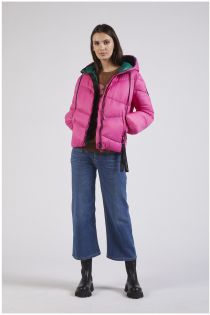 Down jacket made of ultra-soft nylon with contrasting colours between the main fabric and the lining. the real special feature is on the inside where in addition to being printed with our slogan 'be noir' there is a practical strap which on hot days allows the garment to be carried as if it were a rucksack. available in 4 colour versions.