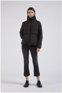 Down jacket with an opaque fabric and tecafènoiric style. the combination of quilted and non-quilted parts gives the garment a modern style.