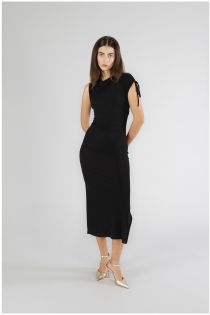 Sleeveless dress in superstretch fabric with drawstring on the shoulder and draping on the side. below the knee length with side slit on one side. perfect dress with high-heeled shoes for a romantic and elegant evening.