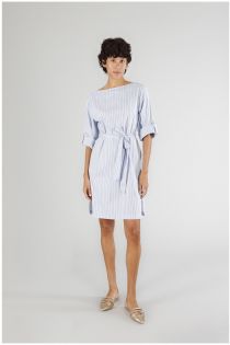 Knee-length dress with bateau neckline made of striped stretch poplin. dress with fabric sash to tie at the waist and side slits. long sleeves that can be rolled up and fastened with a golden button.