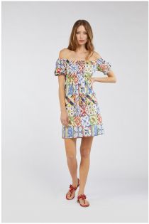 Short dress with Empire cut and gathered neckline, leaving the shoulders delicately uncovered. Three different exclusive printed fabrics to choose from, to suit every taste.