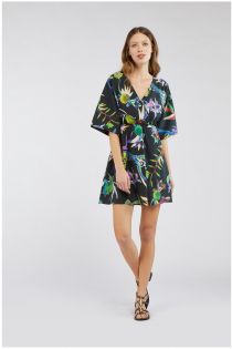 Fresh and comfortable dress, suitable for different physiques, with a delicate gathering under the bust, a cross on the neckline and 3/4 length kimono sleeves.
