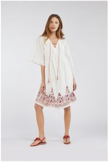 Cotton muslin dress with embroidered detail at the hem. The neckline is decorated with a cord with tassels that creates a fine and sensual cross. Wide ruching trims the wide and practical kimono sleeves.