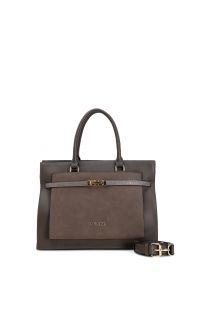 Bowling bag made of different materials with front pocket enhanced by a thin croc print strap.