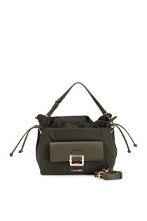 Medium-sized, dual-material bucket bag with pocket on the front, fastened with a metal buckle
