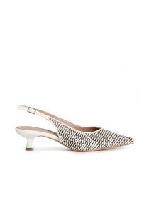 Slingback décolleté with raffia effect lace. slim shape. leather insole. 5 cm spool heel. footwear that combines elegance and modernity. ideal for adding a sophisticated touch to every outfit.