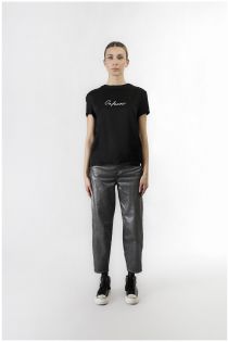 Bi-material short-sleeved t-shirt. the front of the t-shirt and the sleeves are made of viscose satin with our logo printed with a glitter effect. the back is in viscose jersey.