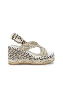 Fabric crossover sandals with a 9.5 cm wrapped wedge. braided strap and comfortable insole. ideal summer footwear with a boho-chic vibe and maximum stability for a fresh trendy look.