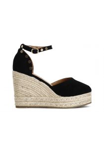 Fabric sandals on a cord wedge and platform. fabric ankle strap. closed-front and -back shoe. gold studs on the reinforced heel and strap.