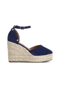 Fabric sandals on a cord wedge and platform. fabric ankle strap. closed-front and -back shoe. gold studs on the reinforced heel and strap.