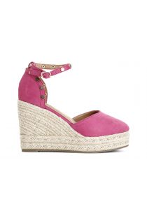 Fabric sandals on a cord wedge and platform. fabric ankle strap. closed-front and -back shoe. gold studs on the reinforced heel and strap.