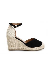Fabric sandals on cord wedge. fabric ankle strap. closed-front and -back shoe.
