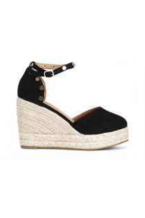 Cord wedge sandals with fabric ankle strap closed front and back with gold studs.