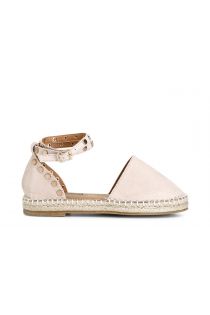 Sandals closed at the back and with a fabric ankle strap with studs on a cord base.