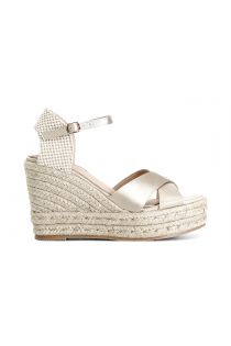 Fabric sandals with two crossed bands. 30 mm-high platform and 90 mm cord wedge.