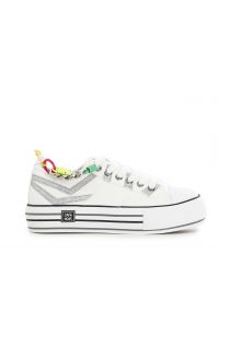 Fabric sneakers with glitter detailing on the back and an accessory with chain and coloured details included. box sole with decorative stripes.