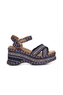 Sandals with ethnic cross. wrapped wedge always in ethnic fabric. the comfortable genuine leather insole makes the shoe comfortable even after several hours of use. the heel is 8 cm high while the plateau is 4 cm.
