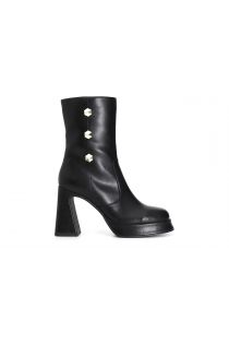 Women's leatherette ankle boot with three hexagonal studs. footwear in perfect seventies style. the 95mm high heel together with the 18mm platform provide a balance of height beauty and comfort.
