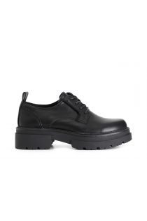 Ladies' lace-up derby shoe in brushed leatherette with rhinestone trim. the insole is leather.
