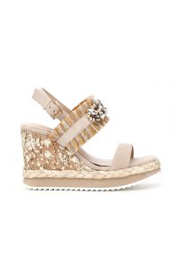Fisherman sandals in suede and multicolour frayed raffia with hardware in rhinestones and wooden beads on multi-material platform.