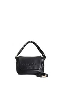 Handbag with flap and high frequency embossed logo braided "chain" handle for an elegant touch and removable shoulder strap for maximum versatility.