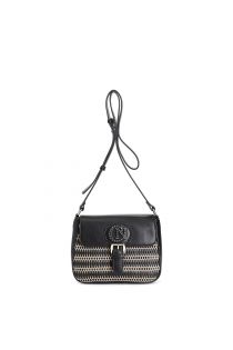 Elegant shoulder bag with flap and front dial in mesh fabric with threads. raw cut logo with hand-stitched details decorative buckle adjustable shoulder strap and magnetic closure. perfect for a casual chic look