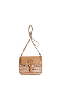 Elegant shoulder bag with flap and front dial in mesh fabric with threads. raw cut logo with hand-stitched details decorative buckle adjustable shoulder strap and magnetic closure. perfect for a casual chic look