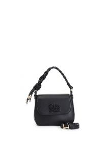 Flap with woven mignon handle and tone-on-tone rectangular embossed logo. bag with a single compartment and an internal zip pocket. magnetic closure. bag with shoulder strap.