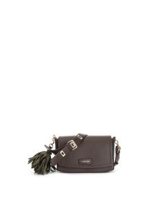 flap with large fabric flower charm, handle with regular buckle dark brown